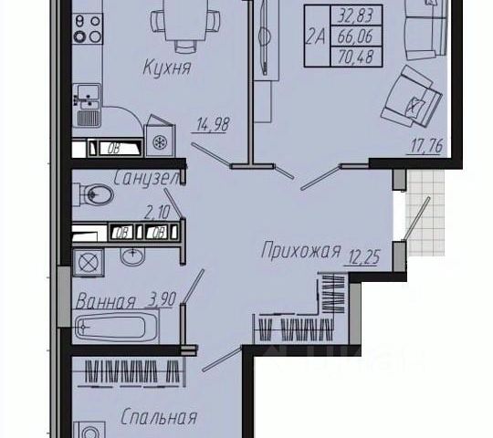 Квартира общей площадью 70 кв.м современной планировки на две стороны: просторная прихожая 12,25 кв.м, две изолированные комнаты, раздельный санузел, кухня-гостиная 14,98 кв.м, ленточная лоджия 8,84 кв.м.
