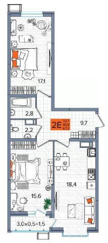 Евродвушка (47.7 кв.м) с объединенной кухней-гостиной, изолированной спальней с гардеробной, санузлом и прачечной. Три выхода на закрытую терассу (площадь 17.8 кв.м), которую можно использовать как лаунж-зону или как отдельную комнату. Квартиру покупали для себя и планировали там сделать обеденную зону, поставить диван и проектор для просмотра фильмов. С закрытой террасы выход на открытую терассу (площадь 39,6 кв.м), где свободно можно разместить шезлонги, мангальную зону и отдыхать будто за городом, покупали квартиру именно с этим расчетом))).