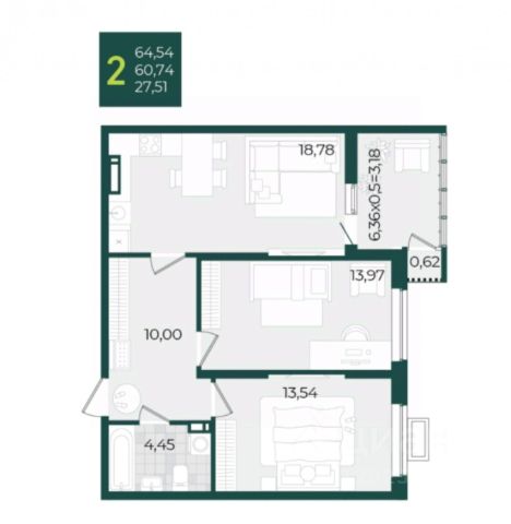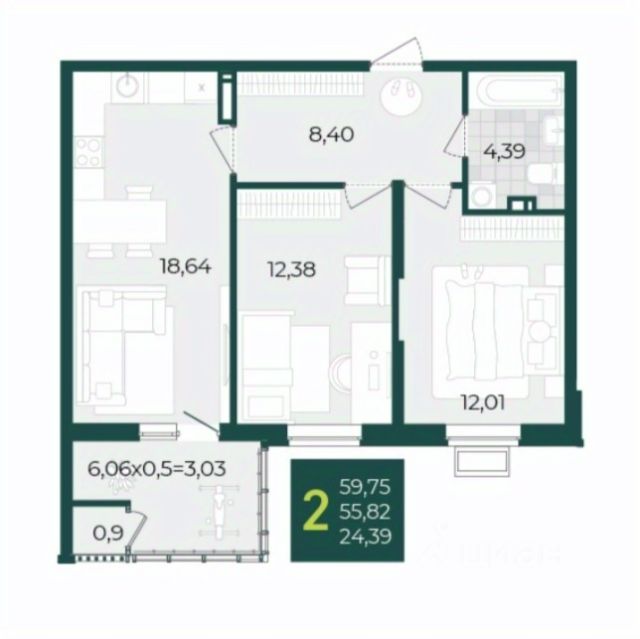 Удобная планировка на 2 стороны: 2 спальни, просторная кухня-гостиная.