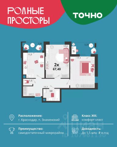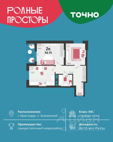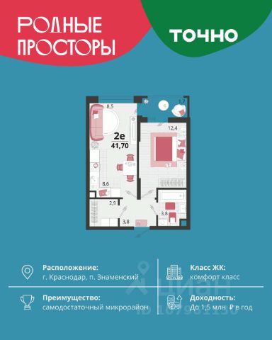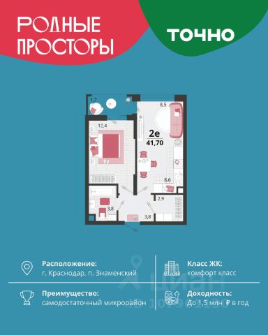 Продается квартира-студия в Жилом комплексе "Родные просторы"! В квартире выполнена качественная предчистовая отделка: Выровненные и подготовленные для отделки финишными материалами стены — улучшенная штукатурка стен. Подготовленный к укладке покрытия пол — стяжка пола. Коммуникации, выведенные в специальных местах в санузлах и кухонной зоне. Металлические входные двери с внутренней фрезеровкой и 2 замками. Металлопластиковые окна с долговечной фурнитурой. Радиаторы со встроенными терморегуляторами. Гидроизоляция пола санузлов. Крутая комплексная застройка территории с развитой инфраструктурой - на территории комплекса расположены школа на 1550 мест, 3 детских сада на 800 мест, поликлиника и частные клиники. На первых этажах домов расположены коммерческие помещения. Дворы свободны от автомобилей. Для автовладельцев предусмотрено более 2000 мест на открытых парковках по периметру микрорайона, и многоуровневые крытые наземные паркинги. Большая часть микрорайона оборудована пешеходными зонами и благоустроенными придомовыми территориями со спортивными площадками и большими детскими игровыми пространствами. Вся инфраструктура района находится в пешей доступности и располагаться внутри микрорайона. Рядом трасса М-4 - удобный выезд в сторону моря! Звоните прямо сейчас и покупайте квартиру в классном жилом комплексе!