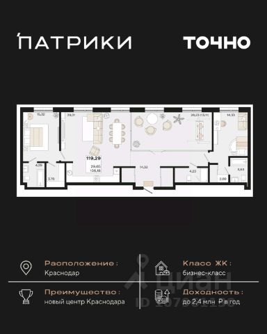 Флагманский проект группы компаний Точно - жилой комплекс бизнес-класса Патрики, это 10 домов разной этажности расположившихся на 28,5 гектарах. Жилой комплекс с концепцией город в город - прогулочные аллеи, парковая территория, 3 детских сада, 2 школы - одна из которых частная, Гранд аллея с ресторанами, фонтанами и модными бутиками, уникальные мафы и ландшафтный дизайн, создают особую атмосферу - место в котором хочется находиться. В Патриках предусмотрен и креативный кластер Цех, который включает в себя пространство для коворкинга, фудкорт, бутики, детский комплекс, лектории, фитнес-клуб Баланс с волной для сёрфа. Но и это еще не все ГК Точно уважает историю, поэтому мы сохранили 2 башни - наследство от завода "Сельмаш" исторический арт-объект назвали Мастер и Маргарита.