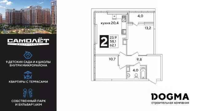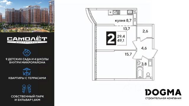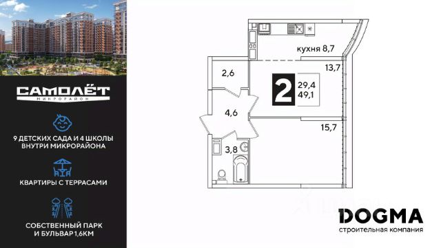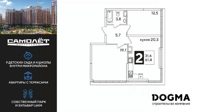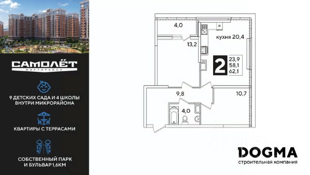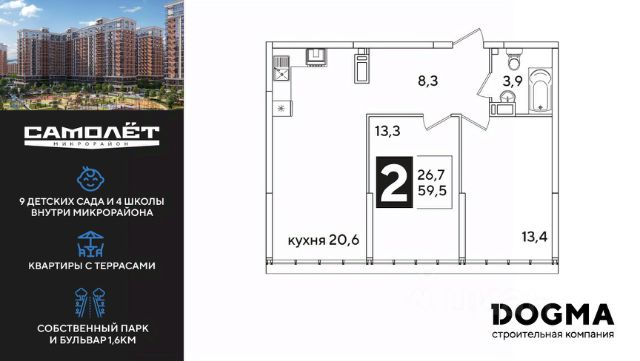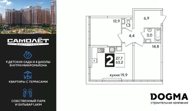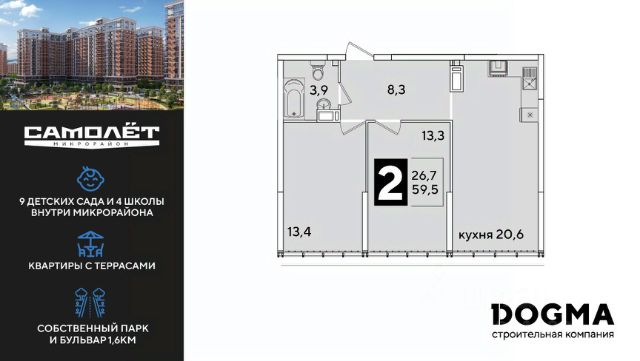 DOGMA - ТОП-3 застройщик по объему строительства в РФ. "САМОЛЁТ" — концептуальный жилой микрорайон, который расположен на северо-западе Краснодара, в районе Западного Обхода. Квартал спроектирован как "город в городе", поэтому здесь будет всё для комфортной жизни: современные дома с разными планировками, дороги, школы и детские сады, поликлиника, торговые центры, парки и аллеи. Микрорайон находится далеко от промышленных предприятий, сочетает удобство городской жизни и экологически благоприятную среду. Инфраструктура нового микрорайона: • 4 школы и 9 детских садов на территории микрорайона • Функциональные планировки • Собственный бульвар протяжённостью 1,6км • Светомузыкальный фонтан протяжённостью 55 метров • Амфитеатр • Парк 7 ГА • Скейт-парк • Детская аква-площадка • Круглосуточное видеонаблюдение и пост охраны Приобрести квартиру можно одним из способов: ипотека, рассрочка, наличный расчет.