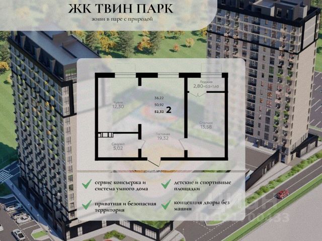 Жилой комплекс состоит из 2 кирпично-монолитных корпусов высотой 16 этажей. Фасады облицованы кирпичом, в подъездах выполнена дизайнерская отделка. На первом этаже предусмотрены помещения для хранения колясок. В каждом корпусе установлены пассажирские и грузовые лифты. В проекте представлены квартиры с 13 комнатами, с панорамными окнами и потолками высотой 2,65 метра. Жилье передается без отделки, в черновом варианте: выполнены базовые строительные работы, включая возведение стен. На стилобатной части комплекса обустроены озелененные дворы, детские и спортивные площадки. Территория организована по концепции без машин. Предусмотрены крытый паркинг на 100 мест и открытая парковка, а также освещенные тротуары. Безопасность обеспечивается видеонаблюдением и контролем доступа на территорию. Для дополнительного комфорта жильцов доступен сервис консьержа и система умного дома. Комплекс расположен в поселке Яблоновский Республики Адыгея. В 5 минутах пешком находится остановка общественного транспорта Космическая улица. В радиусе 515 минут находятся школы, детские сады, кафе, магазины, аптеки, салоны красоты и пункты выдачи. До центра Краснодара, где находятся театры, музеи и культурные достопримечательности, можно добраться за 20 минут транспортом.