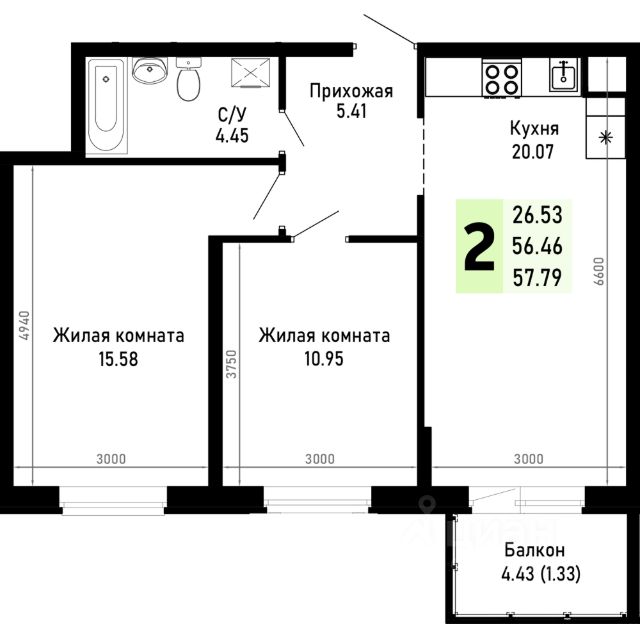 Продаётся 2-комнатная квартира в строящемся доме (квартал 7.1 литер 2), срок сдачи: IV-кв. 2026, общей площадью 57.46 кв.м., на 2 этаже. Новый жилой комплекс по ул. Николая Лебедева от застройщика "ССК"