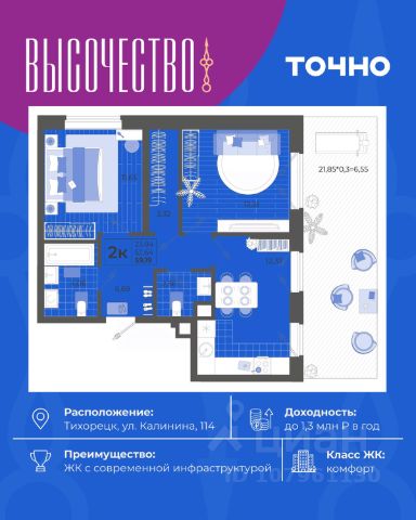 "Высочество" — первый ЖК комфорт-класса в Тихорецке. Современные технологии, новейшие представления о комфорте и эргономике жилья -это, то, что характеризует этот комплекс. Расположен в самом центре города. "Высочество" — это полностью самостоятельный жилой комплекс, жителей которого порадуют закрытый и свободный от машин двор, коммерческая галерея, спортивные и детские площадки с перголами для отдыха, уютная мангальная зона. По периметру жилого комплекса - открытый бесплатный паркинг на 370 м/мест. Недалеко от ЖК "Высочество" находятся детский сад, школы-гимназии, поликлиника, торговый центр, в пешей доступности расположен любимый сквер жителей города "Звездный".
