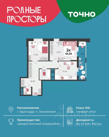 Продается квартира-студия в Жилом комплексе "Родные просторы"! В квартире выполнена качественная предчистовая отделка: Выровненные и подготовленные для отделки финишными материалами стены — улучшенная штукатурка стен. Подготовленный к укладке покрытия пол — стяжка пола. Коммуникации, выведенные в специальных местах в санузлах и кухонной зоне. Металлические входные двери с внутренней фрезеровкой и 2 замками. Металлопластиковые окна с долговечной фурнитурой. Радиаторы со встроенными терморегуляторами. Гидроизоляция пола санузлов. Крутая комплексная застройка территории с развитой инфраструктурой - на территории комплекса расположены школа на 1550 мест, 3 детских сада на 800 мест, поликлиника и частные клиники. На первых этажах домов расположены коммерческие помещения. Дворы свободны от автомобилей. Для автовладельцев предусмотрено более 2000 мест на открытых парковках по периметру микрорайона, и многоуровневые крытые наземные паркинги. Большая часть микрорайона оборудована пешеходными зонами и благоустроенными придомовыми территориями со спортивными площадками и большими детскими игровыми пространствами. Вся инфраструктура района находится в пешей доступности и располагаться внутри микрорайона. Рядом трасса М-4 - удобный выезд в сторону моря! Звоните прямо сейчас и покупайте квартиру в классном жилом комплексе!