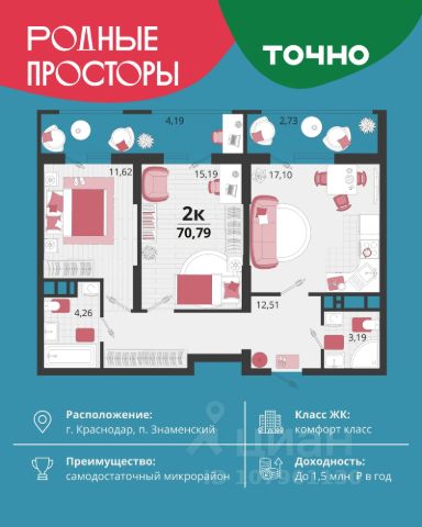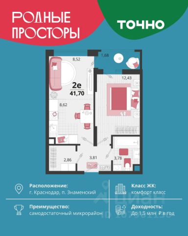 Продается квартира-студия в Жилом комплексе "Родные просторы"! В квартире выполнена качественная предчистовая отделка: Выровненные и подготовленные для отделки финишными материалами стены — улучшенная штукатурка стен. Подготовленный к укладке покрытия пол — стяжка пола. Коммуникации, выведенные в специальных местах в санузлах и кухонной зоне. Металлические входные двери с внутренней фрезеровкой и 2 замками. Металлопластиковые окна с долговечной фурнитурой. Радиаторы со встроенными терморегуляторами. Гидроизоляция пола санузлов. Крутая комплексная застройка территории с развитой инфраструктурой - на территории комплекса расположены школа на 1550 мест, 3 детских сада на 800 мест, поликлиника и частные клиники. На первых этажах домов расположены коммерческие помещения. Дворы свободны от автомобилей. Для автовладельцев предусмотрено более 2000 мест на открытых парковках по периметру микрорайона, и многоуровневые крытые наземные паркинги. Большая часть микрорайона оборудована пешеходными зонами и благоустроенными придомовыми территориями со спортивными площадками и большими детскими игровыми пространствами. Вся инфраструктура района находится в пешей доступности и располагаться внутри микрорайона. Рядом трасса М-4 - удобный выезд в сторону моря! Звоните прямо сейчас и покупайте квартиру в классном жилом комплексе!