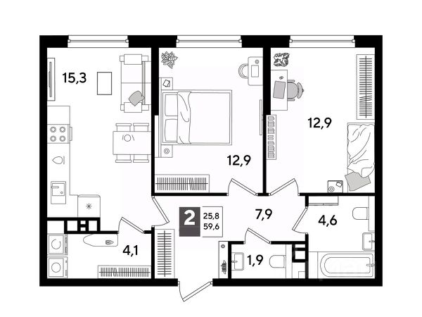 С удобной планировкой: просторная кухня-гостиная и две отдельные спальни. Общая площадь — [50] м².