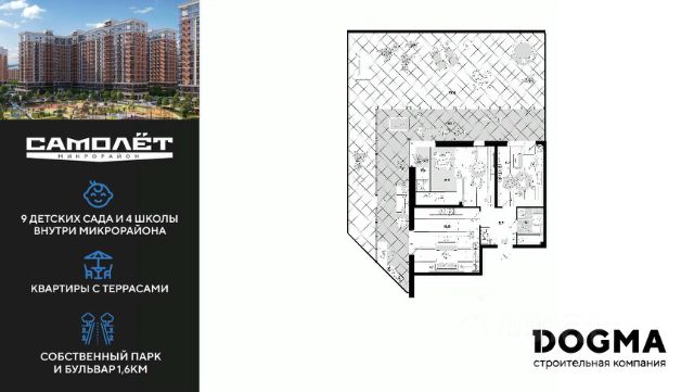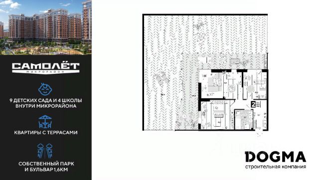 Евродвушка (47.7 кв.м) с объединенной кухней-гостиной, изолированной спальней с гардеробной, санузлом и прачечной. Три выхода на закрытую терассу (площадь 17.8 кв.м), которую можно использовать как лаунж-зону или как отдельную комнату. Квартиру покупали для себя и планировали там сделать обеденную зону, поставить диван и проектор для просмотра фильмов. С закрытой террасы выход на открытую терассу (площадь 39,6 кв.м), где свободно можно разместить шезлонги, мангальную зону и отдыхать будто за городом, покупали квартиру именно с этим расчетом))).