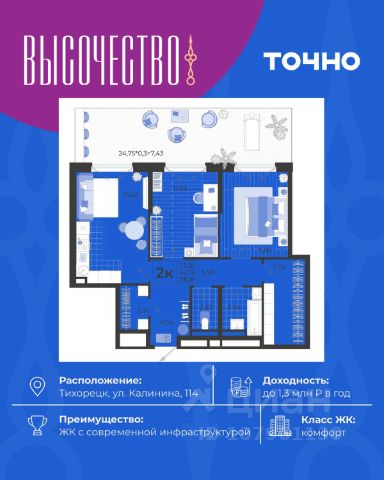 Продаётся 2-комнатная квартира в строящемся доме (дом 60), срок сдачи: IV-кв. 2025, общей площадью 53.15 кв.м., на 5 этаже. Продается квартира напрямую от застройщика. Новый стильный дом, удобная планировка квартиры: большая светлая комната, вместительная кухня и просторная прихожая. Все квартиры в доме сдаются с готовым ремонтом, поэтому переехать можно будет в день получения ключей! РАСПОЛОЖЕНИЕ Квартира находится в перспективном, развивающемся районе Тихорецка - теплого южного города. Вокруг очень много зелени и чистый воздух. В шаговой доступности от ЖК Тихорецк - 3 школы, 2 детских сада, магазины Магнит и Пятерочка, пункты выдачи интернет-заказов. Недалеко от дома - парк и зелёная роща. Совсем рядом расположился Ледовый Дворец - гордость Тихорецка. Все, что нужно для комфортного проживания, находится в 5 минутах от дома! До центра города можно добраться на машине или общественном транспорте за 10 минут. Кстати, остановки общественного транспорта тоже находятся в шаговой доступности. ОСОБЕННОСТИ Литер 2 жилого комплекса Тихорецк - это дом нового уровня стиля и комфорта. Яркий, стильный фасад, дизайнерские входные группы с панорамными дверями, улучшенные детские и спортивные площадки, ландшафтное озеленение с автополивом. Дом выгодно отличают остекленные балконы - это значит, что вы существенно сэкономите деньги и время. Вы непременно оцените удобные входные группы на уровне земли - вам не придётся подниматься с коляской или с тяжелыми пакетами по ступенькам - всего пару шагов, и вы в подъезде. ОТДЕЛКА В квартире вас ждет улучшенный ремонт под ключ: -Надежная металлическая входная дверь -Улучшенные стильные межкомнатные двери -Матовые натяжные потолки -Плотные виниловые обои пастельных тонов -Санузел под ключ: ванна с декоративным экраном, удобная раковина, смесители, полотенцесушитель. На полу керамогранит. -Установлены все радиаторы, выключатели и счетчики -Индивидуальный газовый котел отопления. Горячая вода у вас будет всегда, без перебоев. Вы сможете начать обогрев комнат в любой момент, не дожидаясь отопительного сезона. А еще, газовый котел позволяет существенно экономить. ГИБКИЕ ВАРИАНТЫ ПРИОБРЕТЕНИЯ -ИПОТЕКА СЕМЕЙНАЯ -IT-ИПОТЕКА -РАССРОЧКА -НАЛИЧНЫЙ РАСЧЕТ (предоставляется скидка) -МАТЕРИНСКИЙ КАПИТАЛ -ВСЕ ВИДЫ СЕРТИФИКАТОВ Звоните или приезжайте, и мы проведем для вас экскурсию, покажем квартиры и район и поможем подобрать комфортные условия покупки этой квартиры.