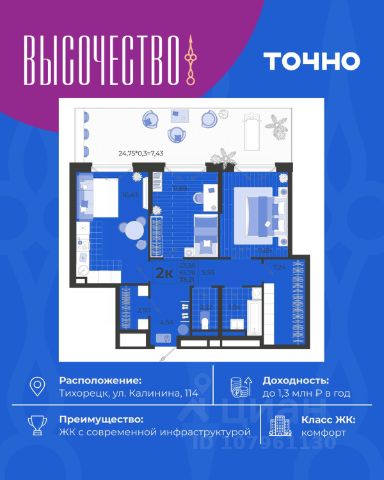 "Высочество" — первый ЖК комфорт-класса в Тихорецке. Современные технологии, новейшие представления о комфорте и эргономике жилья -это, то, что характеризует этот комплекс. Расположен в самом центре города. "Высочество" — это полностью самостоятельный жилой комплекс, жителей которого порадуют закрытый и свободный от машин двор, коммерческая галерея, спортивные и детские площадки с перголами для отдыха, уютная мангальная зона. По периметру жилого комплекса - открытый бесплатный паркинг на 370 м/мест. Недалеко от ЖК "Высочество" находятся детский сад, школы-гимназии, поликлиника, торговый центр, в пешей доступности расположен любимый сквер жителей города "Звездный". 2-комнатной квартиры с евроремонтом в Тихорецке.