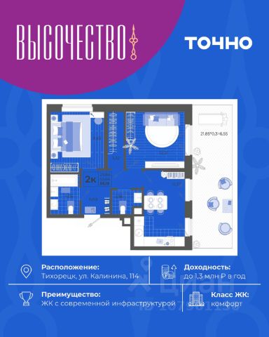 "Высочество" — первый ЖК комфорт-класса в Тихорецке. Современные технологии, новейшие представления о комфорте и эргономике жилья -это, то, что характеризует этот комплекс. Расположен в самом центре города. "Высочество" — это полностью самостоятельный жилой комплекс, жителей которого порадуют закрытый и свободный от машин двор, коммерческая галерея, спортивные и детские площадки с перголами для отдыха, уютная мангальная зона. По периметру жилого комплекса - открытый бесплатный паркинг на 370 м/мест. Недалеко от ЖК "Высочество" находятся детский сад, школы-гимназии, поликлиника, торговый центр, в пешей доступности расположен любимый сквер жителей города "Звездный". Продается 2-комнатная квартира в Тихорецке с хорошим ремонтом .
