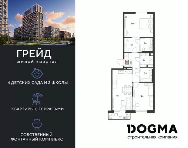 В продаже 2-к квартира от застройщика! ЖК ГРЕЙД г. Краснодар, Литер 14. Срок сдачи: 3 кв. 2028, общей площадью 71.1 кв.м., на 3 этаже. ГРЕЙД от DOGMA: квартал бизнес-класса. Никогда неоклассика не была представлена в краснодарской архитектуре с таким характером. Пока не появился ГРЕЙД, неоклассический квартал, объединяющий строгие формы и величие с прогрессивными технологиями и лаконичностью современного дизайна. Жить в ГРЕЙД — значит чувствовать статус, наслаждаться свободой и управлять своим временем. Квартал с переменной этажностью 9, 16 и 18 этажей предлагает полную инфраструктуру для жизни: 4 детских сада, 2 школы, поликлиника и ФОК расположены в шаговой доступности. Ваши привилегии в ГРЕЙД: - Архитектура в стиле неоклассицизм. - Гранд-лобби с панорамными окнами, мягкой мебелью и выдержанной палитрой. - Закрытый клуб с консьерж-сервисом: - Детский клуб; - Кинотеатр на 20 мест; - Фитнес-рум. - Благоустройство: Парк с фонтаном и амфитеатром, эко-площадки, зоны отдыха, спортивные площадки. - Коммерция на первых этажах с площадками для бизнеса. - Технологии "Умный дом": - Управление через смартфон; - Бесключевой доступ; - Круглосуточное видеонаблюдение; - Интеллектуальные счетчики. - Многоуровневый подземный паркинг с видеонаблюдением, прямым доступом на скоростном лифте и электрозарядками. - Дополнительные удобства: колясочные, велобоксы, кладовые помещения, скоростные лифты. Приобрести квартиру можно одним из способов: - Семейная ипотека. - Рассрочка. - Оплата наличными. - Дистанционная покупка. Позвоните сейчас и узнайте больше о возможностях приобретения квартиры бизнес-класса в ЖК ГРЕЙД!