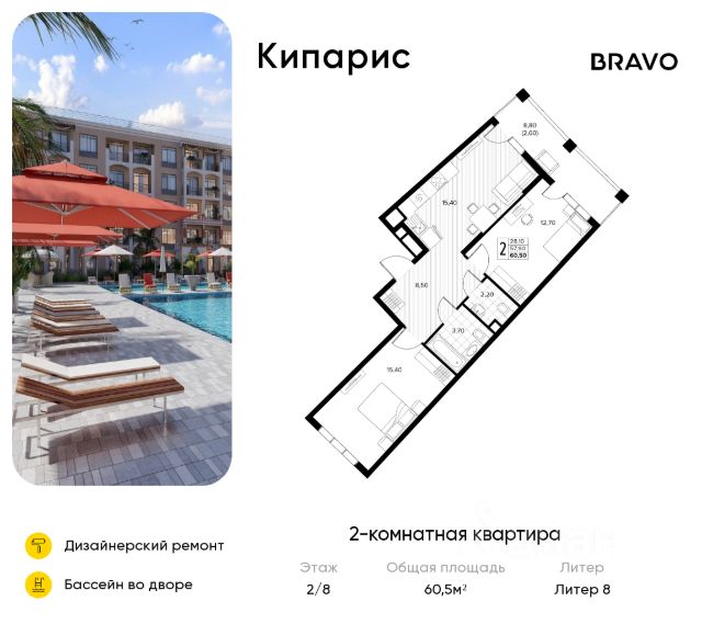 Продается 2-комнатная квартира площадью 55.80 кв. м без отделки, расположенная на 7 этаже, в новом жилом комплексе комфорт-класса "Кипарис". Прекрасный район, окруженный реликтовыми лесами и живописным рельефом гор. Адрес жилого комплекса - муниципальный округ Анапа, село Сукко, улица Мирная, дом 13. "Кипарис" - это жилой комплекс, где проявляется страсть к жизни. Здесь собраны все условия для активного отдыха, 19 бассейнов на территории, собственная развитая социальная инфраструктура и множество квартир с вдохновляющими пейзажами на долину Сукко. Транспортная доступность • Регулярный общественный транспорт для пешеходов • 3 км до Черного моря • Кипарисовое озеро в 7 минутах езды • 12 км до Анапы • 25 км до вокзала • 34 км до аэропорта Архитектура, вдохновленная побережьем моря В состав проекта "Кипарис" вошло 7 домов высотой от 4 до 8 этажей, архитектура которых вдохновлена стилем средиземноморского возрождения. Открытые балконы дают возможность быть ближе к природе. Уникальные террасы, мастер-спальни, просторные гардеробные, лоджии и окна с красивым видом - в планировках продумана каждая мелочь, что и формирует особое ощущение комфорта. Особое внимание в комплексе уделено созданию зон для отдыха и развлечений: на территории расположено 19 бассейнов, которые обеспечивают жителям возможность наслаждаться водными процедурами в любое время, создавая атмосферу курорта прямо у вас дома. Это идеальное место для семейного досуга, где можно расслабиться, позагорать или провести время с друзьями. Бассейны также оборудованы зонами для активных игр и отдыха, что делает "Кипарис" идеальным местом для тех, кто ценит комфорт и активный образ жизни. Насыщенное благоустройство Дом в долине Сукко - это не только бескрайние морские виды, зеленые леса и горы, не только полезный морской воздух, насыщенный ароматом краснокнижного можжевельника и сосен, но и также обширное благоустройство, где резидентам каждый день доступно все необходимое для комфортного отдыха. Во дворе каждого дома находится комплекс бассейнов, уютные шезлонги с зонтиками, изолированные детские и спортивные площадки, теннисные корты, зоны для пикников и барбекю. Двор закрыт от машин: за территорией комплекса предусмотрен паркинг на 3563 машино-места. Инфраструктура • Салоны красоты, кафе, магазины, аптеки на первых этажах; • Собственные детский сад на 200 мест и школа на 1100 мест; • Яхтинг, серфинг и дайвинг в шаговой доступности; • Винодельни, заповедники и достопримечательности в ближайшем окружении. Чтобы узнать подробности, обращайтесь за консультацией по телефону.