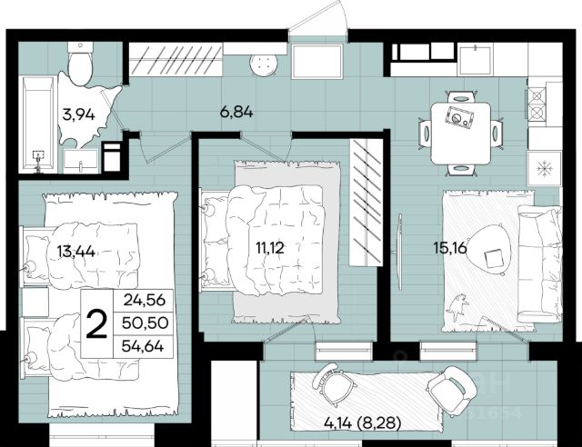 Продаётся 2-комнатная квартира в сданном доме (Литер 2.7), срок сдачи: IV-кв. 2024, общей площадью 50.7 кв.м., на 1 этаже. Расположение, транспортная доступность
