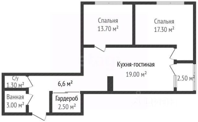 Площадь — 56 м², планировка бабочка, окна на две стороны, много света в течение дня.