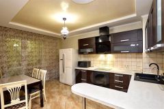 Кухня оборудована современным гарнитуром, варочной панелью и холодильником.