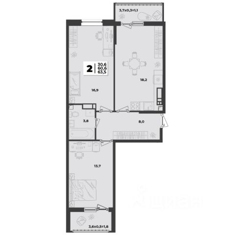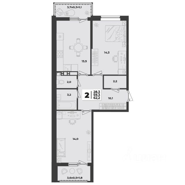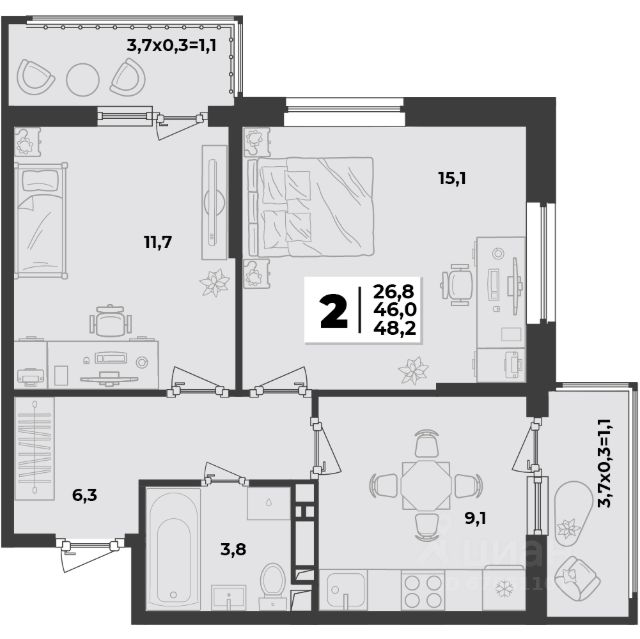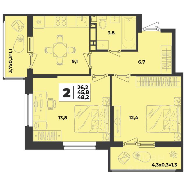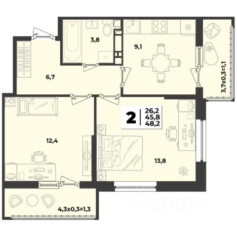 Продаётся 2-комнатная квартира в строящемся доме (Литер 2.1), срок сдачи: IV-кв. 2026, общей площадью 48.2 кв.м., на 2 этаже. Новый жилой комплекс "Лето" от застройщика "ГК Дарстрой" расположен по адресу город Краснодар, улица Западный Обход.