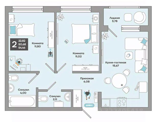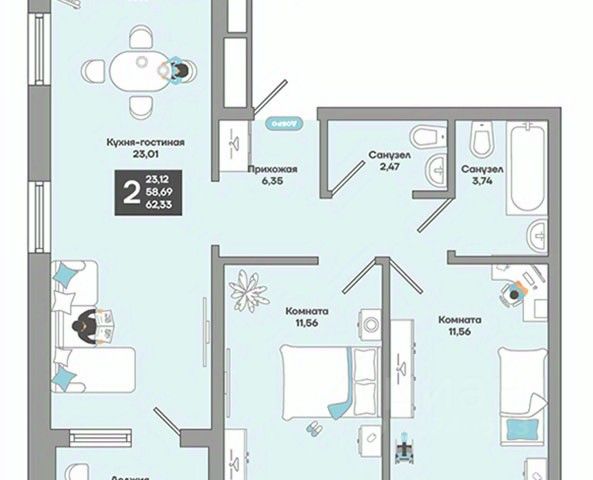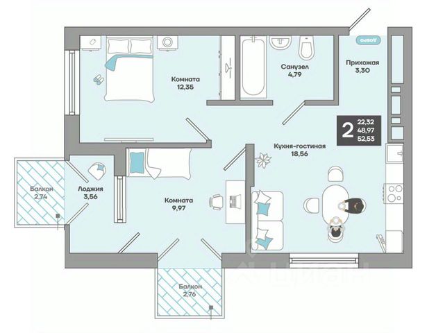 - общая площадь 64,48 кв.м. (в выписке из ЕГРН без учета лоджий 60,9 кв.м.)