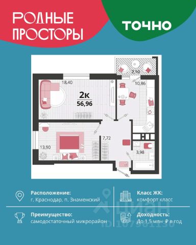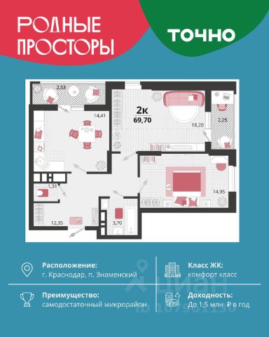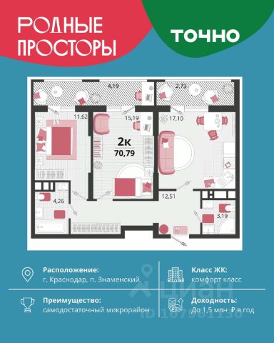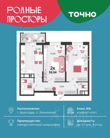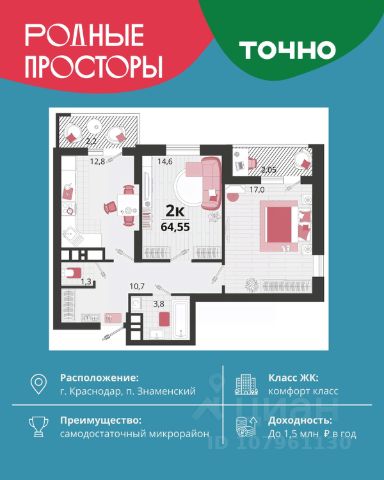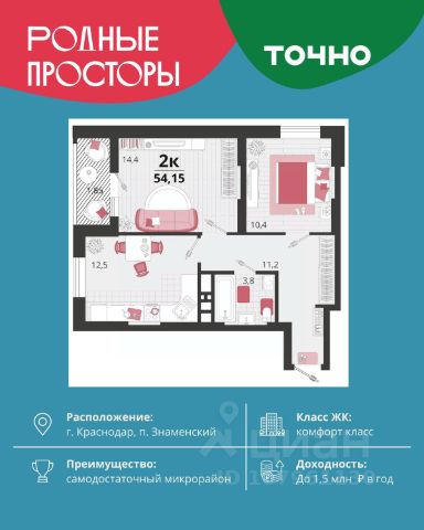 Продается квартира-студия в Жилом комплексе "Родные просторы"! В квартире выполнена качественная предчистовая отделка: Выровненные и подготовленные для отделки финишными материалами стены — улучшенная штукатурка стен. Подготовленный к укладке покрытия пол — стяжка пола. Коммуникации, выведенные в специальных местах в санузлах и кухонной зоне. Металлические входные двери с внутренней фрезеровкой и 2 замками. Металлопластиковые окна с долговечной фурнитурой. Радиаторы со встроенными терморегуляторами. Гидроизоляция пола санузлов. Крутая комплексная застройка территории с развитой инфраструктурой - на территории комплекса расположены школа на 1550 мест, 3 детских сада на 800 мест, поликлиника и частные клиники. На первых этажах домов расположены коммерческие помещения. Дворы свободны от автомобилей. Для автовладельцев предусмотрено более 2000 мест на открытых парковках по периметру микрорайона, и многоуровневые крытые наземные паркинги. Большая часть микрорайона оборудована пешеходными зонами и благоустроенными придомовыми территориями со спортивными площадками и большими детскими игровыми пространствами. Вся инфраструктура района находится в пешей доступности и располагаться внутри микрорайона. Рядом трасса М-4 - удобный выезд в сторону моря! Звоните прямо сейчас и покупайте квартиру в классном жилом комплексе!