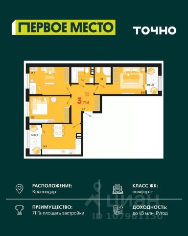 Покупайте выгодно в Краснодаре — самые доступные квартиры в ЖК "Огурцы"! Успейте купить квартиру по специальным условиям в популярном районе Краснодара. Жилой комплекс: Жилой комплекс "Огурцы" представляет собой два современных дома комфорт-класса высотой 22 и 24 этажа, выполненных по монолитно-кирпичной технологии. Характерной особенностью являются окна с элегантной зеленоватой тонировкой, защищающей от солнечных лучей и придающей зданию особый шарм. Во дворе обустроены детская игровая площадка с безопасным покрытием, спортивная зона с баскетбольным кортом и благоустроенные места для приятного отдыха. Дизайн фасадов выполнен в оригинальном стиле, гармонично сочетающемся с окружающей средой. Квартиры: Квартиры в ЖК "Огурцы" спроектированы с учётом принципов эргономики и функциональности. Большие комнаты, высокие потолки и панорамные окна обеспечивают отличное освещение и живописный вид. Просторные лоджии позволяют обустроить зону отдыха или рабочее пространство. Дополнительно предусмотрена коммерческая инфраструктура на нижних этажах, включающая торговые площади и предприятия сферы услуг. Расположение: Микрорайон Молодёжный в Краснодаре — это "город в городе" с развитой инфраструктурой. ЖК "Огурцы" расположен рядом с новым ультрасовременным сквером "Изумрудный" и парком "Ореховая роща". В шаговой доступности находятся школы, детские сады, медицинские учреждения, фитнес-клубы, супермаркеты, салоны красоты, отделения банков, кафе и рестораны. В 10 минутах езды — спортивный центр "Баскетхолл", СК "ЦСКА", Дворец Самбо и торговый центр "Красная площадь". До центра Краснодара 20 минут. Рядом с домом находится остановка общественного транспорта, позволяющая легко добраться в любую точку города. Доступные цены и выгодные условия покупки: Жилой комплекс "Огурцы" предлагает доступные цены на жилую и коммерческую недвижимость с возможностью использования государственных субсидий и кредитных программ, включая семейную ипотеку по сниженной процентной ставке. Это делает покупку квартиры выгодной инвестицией. - Скидка 3% при 100% оплате наличными. - Скидка 1% при бронировании в день показа. - Купи в рассрочку от застройщика — зафиксируй цену! - Скидка которая греет до 9% (Базовая до 5% и суммируется со скидками 1 и 3 %). - Акция для участников СВО и их родственников. - Приведи друга — получи деньги! - Подарочный сертификат на кухню или мебель в подарок. Наш проект предназначен для удовлетворения широкого круга требований покупателей, стремящихся к качеству жизни и хорошей экологии. Здесь созданы оптимальные условия для семейной жизни, активного досуга и качественного проживания. Сделайте правильный выбор, инвестируя в лучшее качество жизни. Наслаждайтесь комфортом современного жилья с удобствами, бережно сохраняя семейный бюджет и получая удовольствие от каждого дня в прекрасном районе! Позвоните или оставьте заявку, чтобы узнать больше и увидеть всё своими глазами! Ваш новый дом ждёт вас! Продается 3-комнатная квартира до 10 млн. рублей в Краснодарском крае.