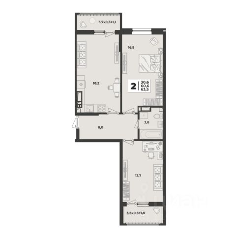 Продаётся 3-комнатная квартира в строящемся доме (Литер 3), срок сдачи: IV-кв. 2027, общей площадью 69.3 кв.м., на 2 этаже.