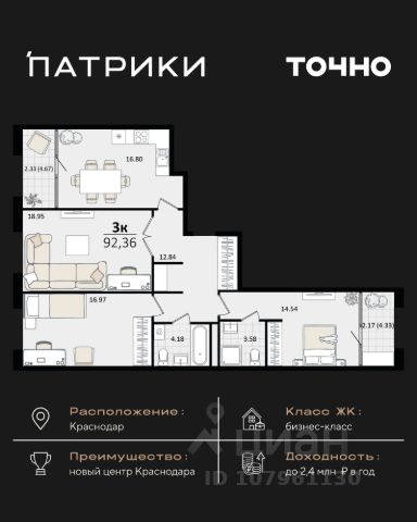 Продается 3-комнатная квартира в ЖК "Режиссёр" в доме (Литер 3), общей площадью 91.85 кв.м., на 12 этаже. Без отделки, но с возможностью заказать ремонт. Преимущества квартиры: просторная прихожая, две лоджии. Жилой комплекс расположен на пересечении улиц Уральская и Старокубанская рядом с крупными торгово развлекательными и деловыми центрами. Развитая инфраструктура, удобная транспортная доступность делают этот район удобным для жизни и работы. Окружение ЖК "Режиссер" уникально для шопинга. ТРЦ центр СБС, Галактика, Ашан, Леруа Мерлен и многие другие в шаговой доступности. Добавит возможности для покупок без ограничений собственная коммерческая инфраструктура. От 4-х до 7 квартир на этаже. Одно из важных преимуществ при выборе квартиры не много соседей рядом.Лифт, который спускается в подземный паркинг и больше количество парковочных мест сделает жизнь в ЖК Режиссёр еще комфортнее! Традиционно благоустройству территории уделено максимальное внимание. Озеленение взрослыми деревьями разных пород, площадки для взрослых и детей станут местом притяжения для всех жителей ЖК "Режиссер". Рядом находится вся необходимая инфраструктура: 5 минут на машине - школа 14 8 минут на машине - детский сад 167 7 минут на машине - поликлиника 15 В шаговой доступности ТЦ Галактика, ТЦ Галактика, Гипермаркет Окей #2WMDO3