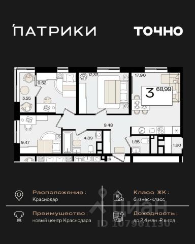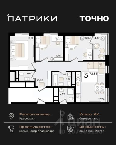Продаётся 3-комнатная квартира в строящемся доме (Дом Литер 1), срок сдачи: 1 кв. 2025, общей площадью 79.14 кв.м., на 12 этаже. Без отделки, но с возможностью заказать отделку Дом URAL естественным образом, благодаря своей форме, образует закрытую территорию. Стильный фасад дополняют застекленные панорамные лоджии и балконы. С верхних этажей в солнечную погоду можно рассмотреть очертания гор Большого Кавказа. На территории комплекса откроется детский сад и фитнес-центр.Дом URAL находится близко к удобным транспортным развязкам, благодаря чему выезд на море за час без пробок! Внимание уделено придомовой территории с ландшафтным озеленением c системой автоматического полива, современным детским и спортивным площадкам. У ЖК огромная двухуровневая парковка на 819 машиномест. Инфраструктура: До ТРК СБС Мегамолл, Ашана, ТРК Галактика - 5 минут на авто или 20 минут пешком Гимназия 88, Академия футбола Краснодар, Детский сад 138 - 5 минут на авто или 20 пешком Поликлиника 17, 7 - 5 минут на авто, 15 пешком Фитнес-клубы 50GYM и X-Fit - 5 минут на авто или 20 пешком Номер квартиры 1719. Подъезд 11.