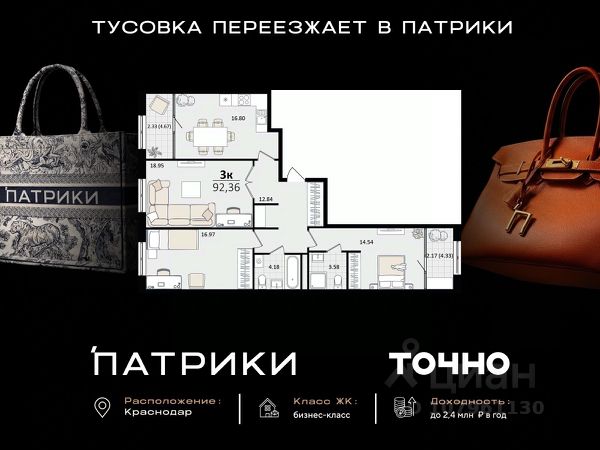 Флагманский проект группы компаний Точно - жилой комплекс бизнес-класса Патрики, это 10 домов разной этажности расположившихся на 28,5 гектарах. Жилой комплекс с концепцией город в город - прогулочные аллеи, парковая территория, 3 детских сада, 2 школы - одна из которых частная, Гранд аллея с ресторанами, фонтанами и модными бутиками, уникальные мафы и ландшафтный дизайн, создают особую атмосферу - место в котором хочется находиться. В Патриках предусмотрен и креативный кластер Цех, который включает в себя пространство для коворкинга, фудкорт, бутики, детский комплекс, лектории, фитнес-клуб Баланс с волной для сёрфа. Но и это еще не все ГК Точно уважает историю, поэтому мы сохранили 2 башни - наследство от завода "Сельмаш" исторический арт-объект назвали Мастер и Маргарита.