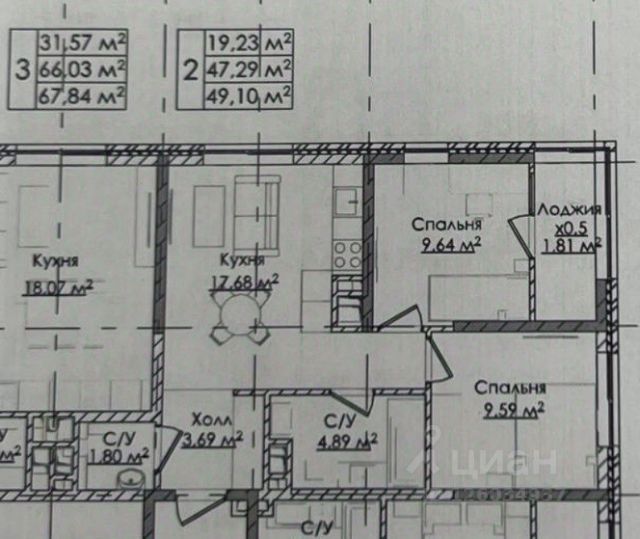 Общая площадь: 57,5 м2
