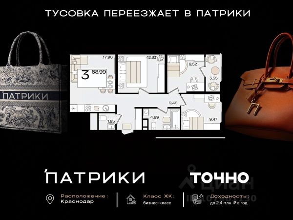 Флагманский проект группы компаний Точно - жилой комплекс бизнес-класса Патрики, это 10 домов разной этажности расположившихся на 28,5 гектарах. Жилой комплекс с концепцией город в город - прогулочные аллеи, парковая территория, 3 детских сада, 2 школы - одна из которых частная, Гранд аллея с ресторанами, фонтанами и модными бутиками, уникальные мафы и ландшафтный дизайн, создают особую атмосферу - место в котором хочется находиться. В Патриках предусмотрен и креативный кластер Цех, который включает в себя пространство для коворкинга, фудкорт, бутики, детский комплекс, лектории, фитнес-клуб Баланс с волной для сёрфа. Но и это еще не все ГК Точно уважает историю, поэтому мы сохранили 2 башни - наследство от завода "Сельмаш" исторический арт-объект назвали Мастер и Маргарита.