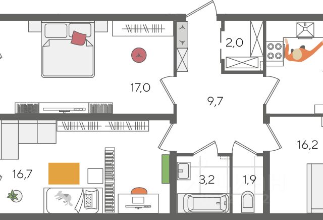 В каждой комнате выведены под кондиционер, бра, ТВ кабели. Проведен интернет.