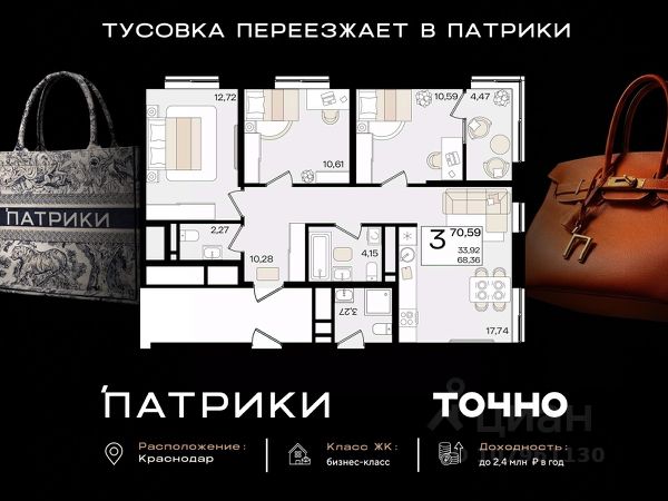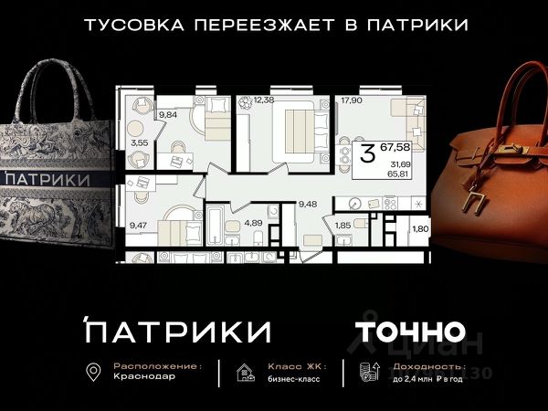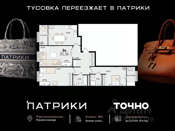 Продаётся 3-комнатная квартира в сданном доме (Литер 1.3), срок сдачи: IV-кв. 2025, общей площадью 58.8 кв.м., на 6 этаже. Флагманский проект группы компаний Точно - жилой комплекс бизнес-класса Патрики, это 10 домов разной этажности расположившихся на 28,5 гектарах. Жилой комплекс с концепцией город в город - прогулочные аллеи, парковая территория, 3 детских сада, 2 школы - одна из которых частная, Гранд аллея с ресторанами, фонтанами и модными бутиками, уникальные мафы и ландшафтный дизайн, создают особую атмосферу - место в котором хочется находиться. В Патриках предусмотрен и креативный кластер Цех, который включает в себя пространство для коворкинга, фудкорт, бутики, детский комплекс, лектории, фитнес-клуб Баланс с волной для сёрфа. Но и это еще не все ГК Точно уважает историю, поэтому мы сохранили 2 башни - наследство от завода "Сельмаш" исторический арт-объект назвали Мастер и Маргарита.