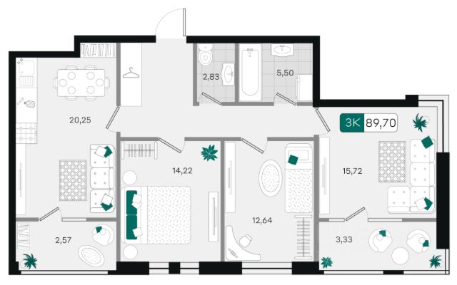 Продается трехкомнатная квартира площадью 90 кв.м. с просторной кухней-гостиной.