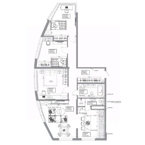 Роскошная планировка, в квартире очень просторная кухня-гостиная для встреч с семьей и друзьями, спальня, кабинет, две детские комнаты, холл, коридор, гардеробная, 2 санузла, хозяйственная комната, помещение для стирки и глажки белья, лоджия.