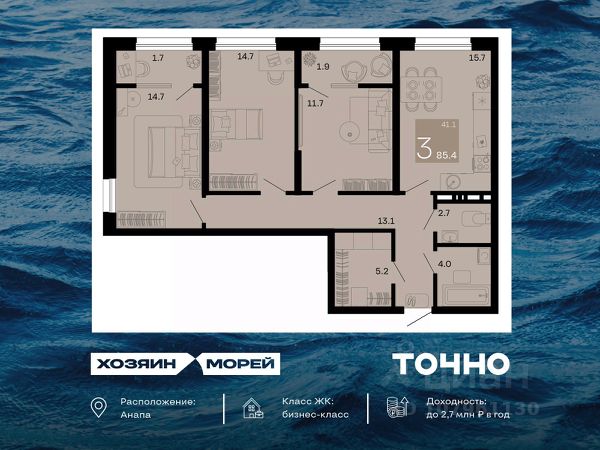 Квартира впечатляет своей планировкой и простором. Вас ждет довольно просторный коридор 13,7 кв.м с возможностью установить вместительный шкаф купе вдоль всего коридора, светлая и уютная кухня-гостиная 16,2 кв.м , а также удобные жилые комнаты 12,6 кв.м и 11,9 кв.м , 12,4м кв с противоположной стороны квартиры. Два санузла принесут дополнительный комфорт в вашу повседневную жизнь. Обременений нет!