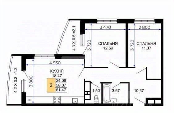 Общая площадь: 58.3 м2, с учетом лоджий 61, 4 м2.