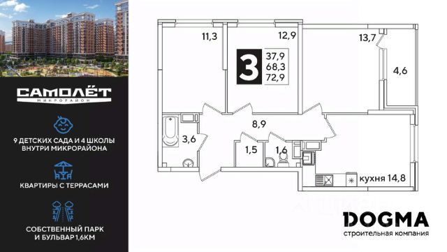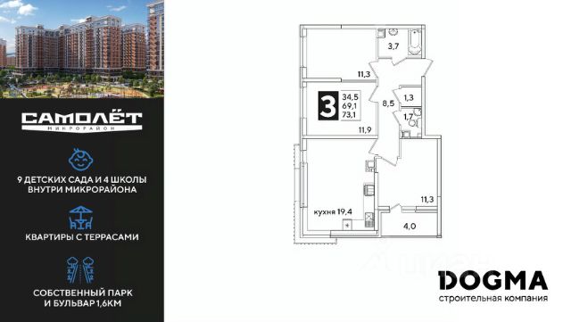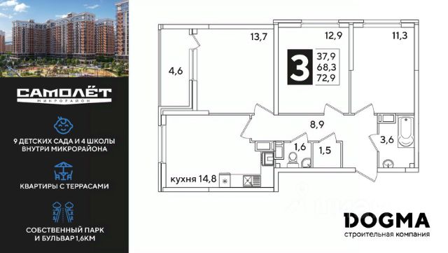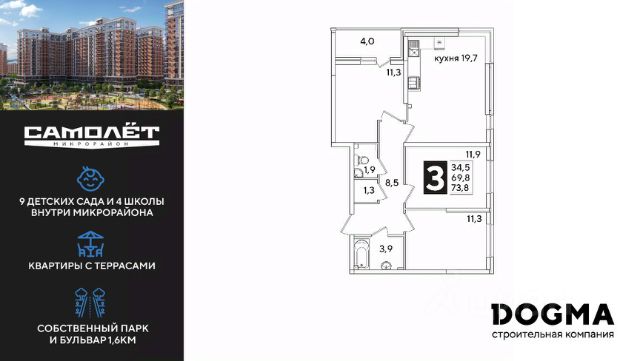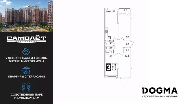 DOGMA - ТОП-3 застройщик по объему строительства в РФ. "САМОЛЁТ" — концептуальный жилой микрорайон, который расположен на северо-западе Краснодара, в районе Западного Обхода. Квартал спроектирован как "город в городе", поэтому здесь будет всё для комфортной жизни: современные дома с разными планировками, дороги, школы и детские сады, поликлиника, торговые центры, парки и аллеи. Микрорайон находится далеко от промышленных предприятий, сочетает удобство городской жизни и экологически благоприятную среду. Инфраструктура нового микрорайона: • 4 школы и 9 детских садов на территории микрорайона • Функциональные планировки • Собственный бульвар протяжённостью 1,6км • Светомузыкальный фонтан протяжённостью 55 метров • Амфитеатр • Парк 7 ГА • Скейт-парк • Детская аква-площадка • Круглосуточное видеонаблюдение и пост охраны Приобрести квартиру можно одним из способов: ипотека, рассрочка, наличный расчет.