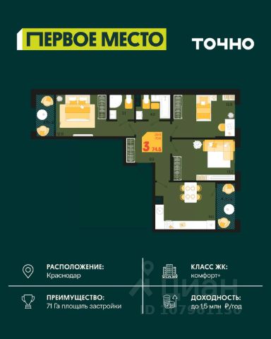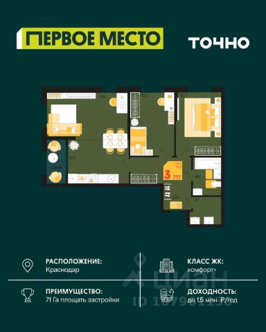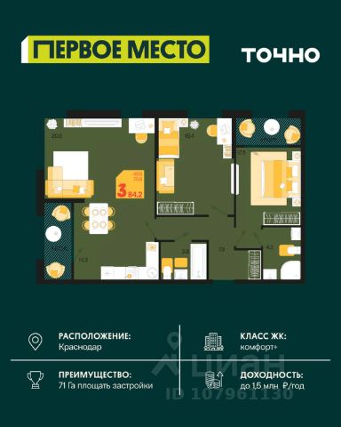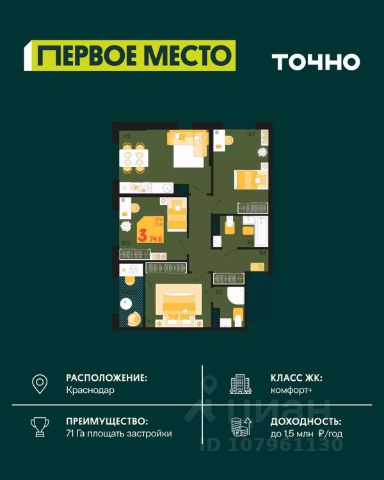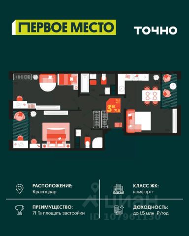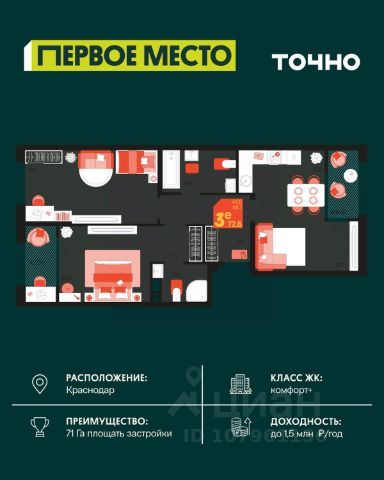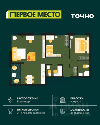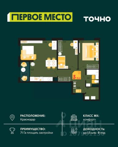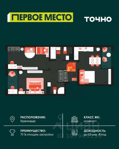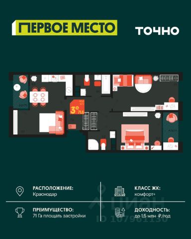 Жилой комплекс "Первое место" — современный проект, возведенный по технологии монолитного строительства с фасадами, облицованными штукатуркой с подсветкой в ночное время. Дома квартала имеют переменную этажность, что позволяет сформировать разнообразную архитектурную среду. В здании имеются пассажирский и грузовой лифты, дизайнерские холлы с зонами отдыха, колясочные и кладовые для хранения сезонных вещей. В проекте представлено множество планировочных решений — от студий до просторных 4х-комнатных квартир как в классических, так и в европланировках, в том числе имеющие мастер-спальни, ниши для шкафов и стиральных машин, встроенные лоджии с панорамным остеклением. Лоты сдаются с черновой и чистовой отделкой, высотой потолков до 3 метров и увеличенными окнами. Территория комплекса благоустроена: имеется двор с ландшафтным дизайном, места для активного времяпрепровождения и отдыха, зоны выгула собак. Развита социальная инфраструктура внутри комплекса — имеются школы, детские сады, медицинские и спортивные учреждения. Для автовладельцев предусмотрен подземный паркинг. Жилой комплекс "Первое место" располагается в новом районе города — Новознаменском, в Карасунском округе северо-восточной части Краснодара, и имеет выезд на трассы М4 "ДОН" и "Джубга-Сочи" в направлении Черного моря и горнолыжных курортов. В пешей доступности находятся продовольственные магазины, торговые центры, медицинские и образовательные учреждения, кафе и рестораны. До цента краснодара — 30 минут.
