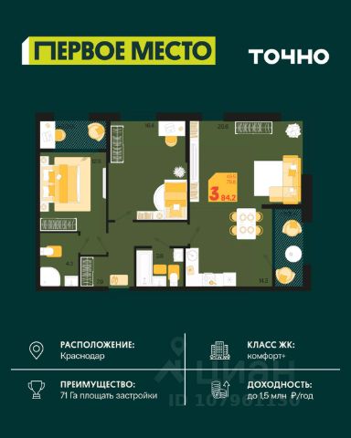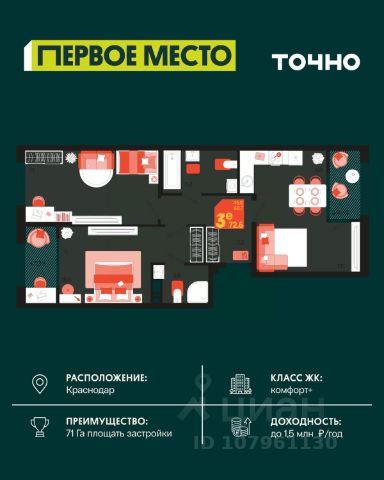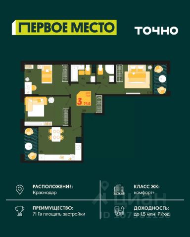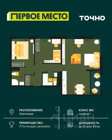 Жилой комплекс "Первое место" — современный проект, возведенный по технологии монолитного строительства с фасадами, облицованными штукатуркой с подсветкой в ночное время. Дома квартала имеют переменную этажность, что позволяет сформировать разнообразную архитектурную среду. В здании имеются пассажирский и грузовой лифты, дизайнерские холлы с зонами отдыха, колясочные и кладовые для хранения сезонных вещей. В проекте представлено множество планировочных решений — от студий до просторных 4х-комнатных квартир как в классических, так и в европланировках, в том числе имеющие мастер-спальни, ниши для шкафов и стиральных машин, встроенные лоджии с панорамным остеклением. Лоты сдаются с черновой и чистовой отделкой, высотой потолков до 3 метров и увеличенными окнами. Территория комплекса благоустроена: имеется двор с ландшафтным дизайном, места для активного времяпрепровождения и отдыха, зоны выгула собак. Развита социальная инфраструктура внутри комплекса — имеются школы, детские сады, медицинские и спортивные учреждения. Для автовладельцев предусмотрен подземный паркинг. Жилой комплекс "Первое место" располагается в новом районе города — Новознаменском, в Карасунском округе северо-восточной части Краснодара, и имеет выезд на трассы М4 "ДОН" и "Джубга-Сочи" в направлении Черного моря и горнолыжных курортов. В пешей доступности находятся продовольственные магазины, торговые центры, медицинские и образовательные учреждения, кафе и рестораны. До цента краснодара — 30 минут.