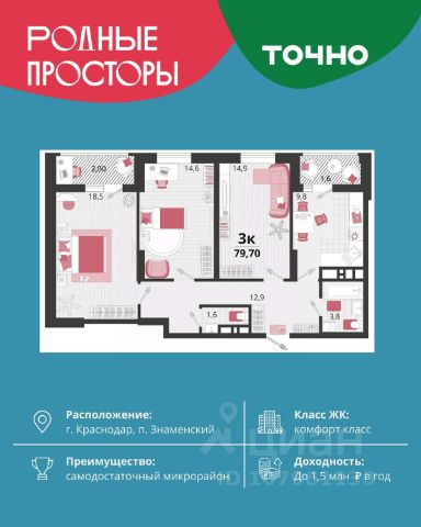 Продается квартира-студия в Жилом комплексе "Родные просторы"! В квартире выполнена качественная предчистовая отделка: Выровненные и подготовленные для отделки финишными материалами стены — улучшенная штукатурка стен. Подготовленный к укладке покрытия пол — стяжка пола. Коммуникации, выведенные в специальных местах в санузлах и кухонной зоне. Металлические входные двери с внутренней фрезеровкой и 2 замками. Металлопластиковые окна с долговечной фурнитурой. Радиаторы со встроенными терморегуляторами. Гидроизоляция пола санузлов. Крутая комплексная застройка территории с развитой инфраструктурой - на территории комплекса расположены школа на 1550 мест, 3 детских сада на 800 мест, поликлиника и частные клиники. На первых этажах домов расположены коммерческие помещения. Дворы свободны от автомобилей. Для автовладельцев предусмотрено более 2000 мест на открытых парковках по периметру микрорайона, и многоуровневые крытые наземные паркинги. Большая часть микрорайона оборудована пешеходными зонами и благоустроенными придомовыми территориями со спортивными площадками и большими детскими игровыми пространствами. Вся инфраструктура района находится в пешей доступности и располагаться внутри микрорайона. Рядом трасса М-4 - удобный выезд в сторону моря! Звоните прямо сейчас и покупайте квартиру в классном жилом комплексе!
