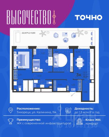 Квартира находится в перспективном, развивающемся районе Тихорецка - теплого южного города. Вокруг очень много зелени и чистый воздух. В шаговой доступности от ЖК Тихорецк - 3 школы, 2 детских сада, магазины Магнит и Пятерочка, пункты выдачи интернет-заказов. Недалеко от дома - парк и зелёная роща. Совсем рядом расположился Ледовый Дворец - гордость Тихорецка. Все, что нужно для комфортного проживания, находится в 5 минутах от дома! До центра города можно добраться на машине или общественном транспорте за 10 минут. Кстати, остановки общественного транспорта тоже находятся в шаговой доступности.