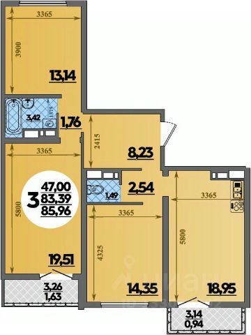 • Санузел под ключ: ванна с декоративным экраном, удобная раковина с пьедесталом, смесители, полотенцесушитель. На полу керамогранит