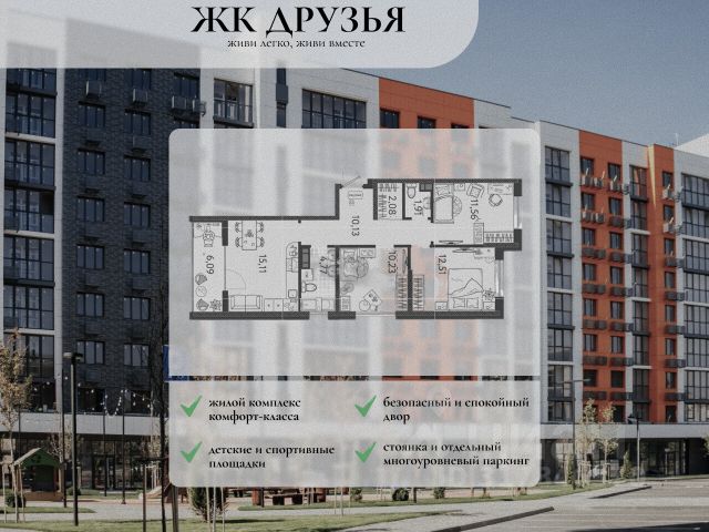 Продаётся 3-комнатная квартира в сданном доме (Литер 2.2), срок сдачи: II-кв. 2024, общей площадью 59.8 кв.м., на 2 этаже. Расположение, транспортная доступность Жилой квартал "Спортивная деревня" занимает территорию 23 га у шоссе Западный Обход. Это экологически чистый и молодой район на северо-западе Краснодара, окруженный дачными поселками и сельскохозяйственными полями и расположенный в 12 км от центра города. Здесь ведется жилищное строительство, развивается социальная, коммерческая и транспортная инфраструктура. Около комплекса расположена остановка автобусов и маршрутных такси с новым названием "Спортивная деревня", запланирована прокладка троллейбусной линии. Инфраструктура На первых этажах домов открываются магазины, службы быта, отделения банков, салоны красоты, офисы компаний, сферы услуг и т.д. Внутри комплекса строятся детский сад и общеобразовательная школа. До открытия собственного учебного заведения организован школьный автобус, который отвозит детей к школе 68. В получасе езды на автомобиле расположены Ледовый дворец, спорткомплексы "Баскет-Холл" и "Город спорта", Центр водных видов спорта. Рядом с домом находятся остановки автобусов и маршрутных такси, на которых можно доехать: до гипермаркета "О`кей", мега-центра "Красная площадь", ТРК "МЕГА Адыгея-Кубань", ТРЦ "Галерея", супермаркетов "Магнит" и "Табрис", Кубанского аграрного университета, детской школы искусств, Краснодарского цирка и многих других объектов инфраструктуры. Надежность застройщика Проект комплексной застройки "Спортивная деревня" реализует корпорация "Девелопмент-Юг", которая была основана в 1995 году и входит в тройку крупнейших застройщиков южного региона России. Приступив к работе над проектом, компания имела значительный опыт в сфере жилищного строительства: на ее счету было около 100 введенных в эксплуатацию домов в десятках комплексов, среди которых "Тургеневский двор", "Три богатыря", "Фестивальный", "Новый город", "Симфония", "Триумф", "Прогресс" и другие. С 2013 года корпорация специализируется на комплексном освоении территорий, создавая жилые микрорайоны с инфраструктурой. Первыми объектами нового направления стали ЖК "Прогресс" и "Спортивная деревня" (работа начата в 2014 году). Приоритетная технология - монолитно-каркасное домостроение, классы жилья - "эконом", "комфорт" и "бизнес". Среди объектов премиального уровня - ЖК "Ривьера". На жилые дома застройщик дает пятилетнюю гарантию, построенные дома обслуживает его собственная управляющая компания. Строительство ведется в соответствии с требованиями закона 214-ФЗ. Покупателям предложен весь набор опций по условиям оплаты: ипотека, материнский капитал, рассрочка, бесплатные консультации, оформление и страхование сделки. Архитектура На территории 23 гектара строится жилой микрорайон из 19 монолитно-кирпичных домов высотой от 9 до 12 этажей. Всего в "Спортивной Деревне" запланировано 4350 квартир площадью от 22 до 71 кв. м. Планировки разные: есть традиционные квартиры (однокомнатные 30