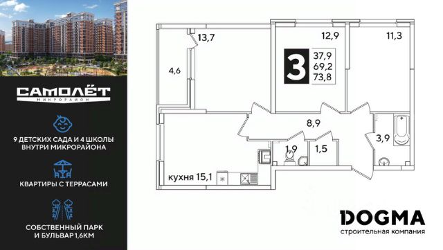 DOGMA - ТОП-3 застройщик по объему строительства в РФ. В продаже 3-комнатная квартира от застройщика! ЖК "Парк Победы 2", г. Краснодар, Литер 13 Срок сдачи: 4 кв. 2025, общей площадью 101 кв.м., на 2 этаже. Концептуально новый микрорайон "ПАРК ПОБЕДЫ" это статная архитектура, вдохновленная наследием страны. Уникальное культурное пространство в стиле сталинского ампира, который отличает монументальность, классические пропорции и четкость линий. •Безбарьерная среда •Сквозные подъезды •Авторские лобби •Видовые квартиры с панорамным остеклением •Квартиры с мастер-спальнями и отдельными гардеробными •Потолки 3 метра •Улучшенная отделка от застройщика •Подземный паркинг и кладовые •Дворы без машин с видеонаблюдением •Круглосуточный пост охраны •Школа для 1 550 учеников •4 детских сада •Уличные тренажёры, зоны для пинг-понга и йоги •Крытый боксёрский ринг •Собственный пешеходный бульвар •Прогулочные аллеи с фонтаном •Коммерческие помещения на первых этажах Приобрести квартиру можно одним из способов: -субсидированная семейная ипотека 4,5 % на весь срок -рассрочка до конца строительства -оплата наличными -дистанционная покупка Позвоните сейчас и забронируйте квартиру со скидкой!