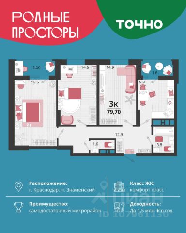 Продаётся 3-комнатная квартира в строящемся доме (Литер 12), срок сдачи: IV-кв. 2025, общей площадью 75 кв.м., на 2 этаже. "Родные просторы"- самодостаточный микрорайон, который реализован по принципу комплексного развития территории, где есть вся инфраструктура для комфортной жизни. На территории 41 га 29 домов от 9 до 24 этажей, уютные дворы со спортивными и игровыми площадками, социальные и коммерческие объекты, зеленые массивы и фонтаны. Главная точка притяжения "Родных просторов" - парк семейного отдыха площадью 9 га, 4,5 км прогулочных аллей, амфитеатр для мероприятий, кинофестивальная площадка. Особая гордость микрорайона современная школа на 1550 мест и 3 детских сада "Ладушки", "Веснушки" и "Топотушки" на 880 малышей. В центре микрорайона строятся фитнес-клуб BALANCE с акватермальным комплексом и собственная поликлиника, площадью более 5000 кв.м. Уже открыт православный храм Святых Первоверховных апостолов Петра и Павла.