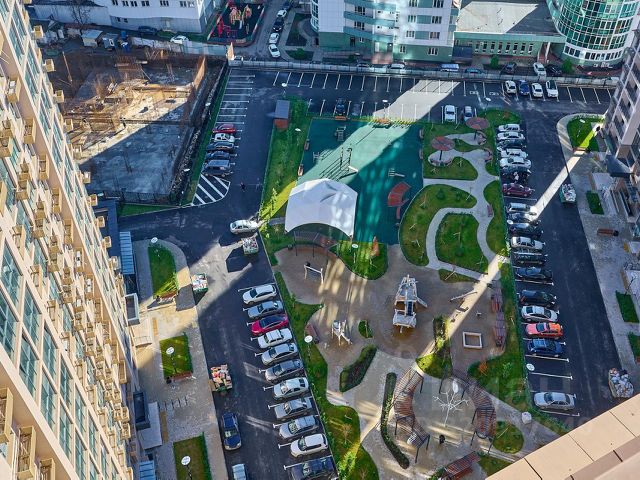 Придомовая территория хорошо обустроена. Здесь высажены деревья, кустарники, клумбы с цветами, выделена специальная зона отдыха со скамейками, универсальная спортивная площадка для игры в футбол, баскетбол. Дети смогут хорошо развлечься на игровой площадке с безопасным покрытием, там установлены различные тренажёры и песочницы.