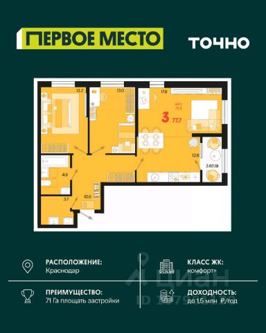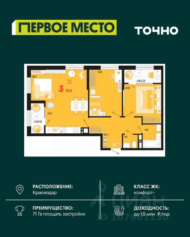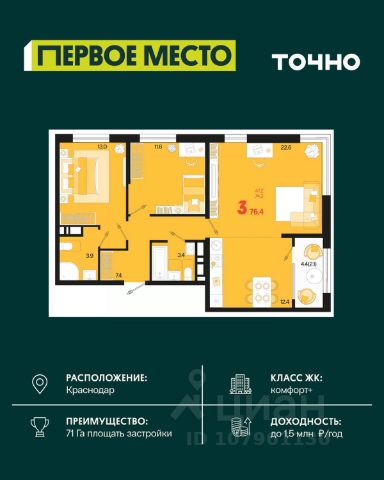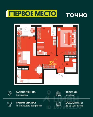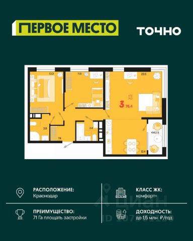 Жилой район "Первое место"- один из самых масштабных проектов в России. На территории 71 га 18 кварталов, 31 дом переменной этажности от 8 до 18 этажей, собственный парк 9 га, храмовый комплекс, пешеходный бульвар "Круг семьи", детские и спортивные площадки, мангальные зоны и различные локации для отдыха. В шаговой доступности действующие муниципальные образовательные учреждения: школа на 1 100 мест и детский сад на 250 мест. Помимо этого, в жилом районе "Первое место" построятся школа на 1700 мест с крытым 25-метровым бассейном и 5 детских садов на 1 490 мест. На первых этажах многоуровневых парковок "паркхабов" разместится более 61 тыс м2 коммерческих помещений. Жителям будут доступны собственный фитнес-центр, кафе, рестораны и магазины. В каждом подъезде предусмотрены дизайнерские холлы в стиле лобби отелей, консьерж-сервис, лапомойки, отдельные колясочные и велосипедные. Также в домах будут просторные кладовые помещения и комнаты для хранения почты с почтоматами для получения посылок из маркетплейсов.