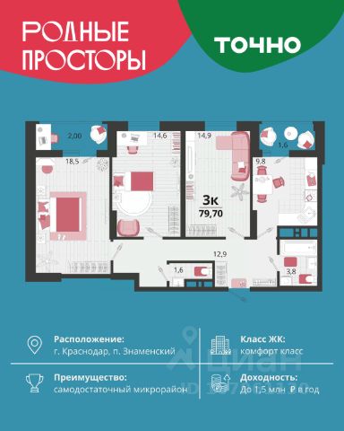 "Родные просторы"- самодостаточный микрорайон, который реализован по принципу комплексного развития территории, где есть вся инфраструктура для комфортной жизни. На территории 41 га 29 домов от 9 до 24 этажей, уютные дворы со спортивными и игровыми площадками, социальные и коммерческие объекты, зеленые массивы и фонтаны. Главная точка притяжения "Родных просторов" - парк семейного отдыха площадью 9 га, 4,5 км прогулочных аллей, амфитеатр для мероприятий, кинофестивальная площадка. Особая гордость микрорайона современная школа на 1550 мест и 3 детских сада "Ладушки", "Веснушки" и "Топотушки" на 880 малышей. В центре микрорайона строятся фитнес-клуб BALANCE с акватермальным комплексом и собственная поликлиника, площадью более 5000 кв.м. Уже открыт православный храм Святых Первоверховных апостолов Петра и Павла.