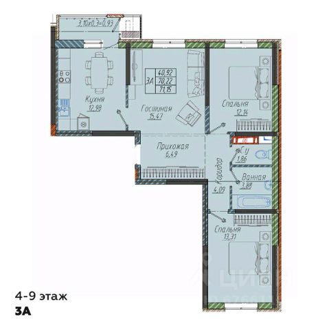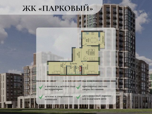 Практичная планировка для семьи включает в себя 3 спальни с рабочими зонами, просторная гостиная, кухня, два санузла, прихожая, зоны хранения и зона постирочной.